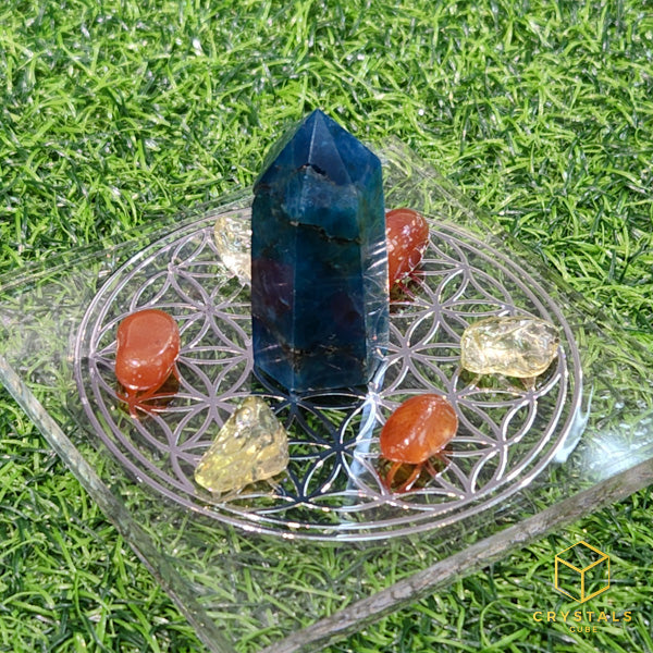Flower of life and Metatron’s Cube are energy symbols that can amplify the energy of the crystal(s) that is placed on it.